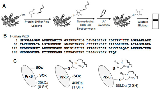In biological samples containing multiple proteins, proteins of interest can be studied using the -SulfoBiotics- Protein Redox State Monitoring Kit Plus. This “Plus” system contains the 15-kDa Protein-SHifter Plus whose DNA moiety can come off after electrophoresis by exposing the gels to UV light, aiding in visualizing the thiol redox states using Western blotting (Figure 2A) [19].
