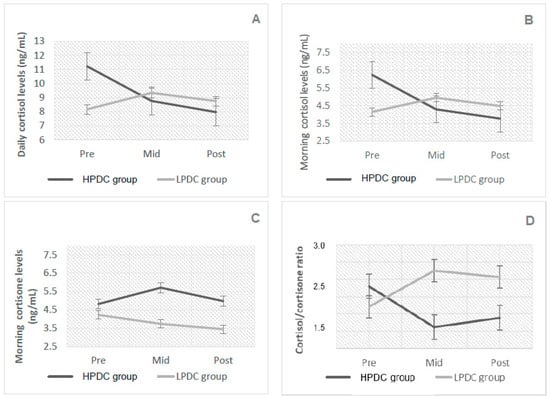 Salivary glucocorticoid measures at baseline, 2 weeks, and 4 weeks following HPDC and LPDC (mean values ± standard deviation); (A) Daily cortisol (ng/mL), p < 0.001; (B) morning cortisol (ng/mL), p < 0.001; (C) morning cortisone (ng/mL), n.s.; (D) cortisol/cortisone ratio, p < 0.001.