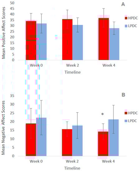 Mean Positive and Negative Affect Schedule (PANAS) scores for positive affect (PA) and negative affect (NA) at baseline, 2 weeks, and 4 weeks following HPDC and LPDC (mean values ± standard deviation); (A) mean PA score, n.s.; (B) mean NA score, n.s. * Significant effect of treatment and time on overall NA (p = 0.02) within the HPDC group after 4 weeks.