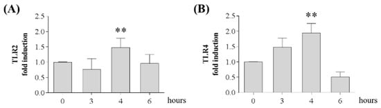 A time-dependent induction of TLR mRNA was detected by incubating cells with the Oxy-mix for 3, 4 and 6 h. As shown in Figure 1, TLR4 appeared to be activated earlier than TLR2 as it was already activated after 3 h (Figure 1B); however, the significant induction of both TLRs compared to control (Time 0) was only obtained after 4 h of cell incubation. TLR up-regulated expression by Oxy-mix was further confirmed by the detected receptors’ protein synthesis (Figure S2).
