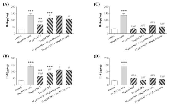 The incubation with 60 µM Oxy-mix for 24 h induced a strong interleukin increase. Among the four HFs, only HF3 and HF4 were able to fully prevent IL-8 induction with both 10 and 25 µg/mL concentrations (Figure 4).