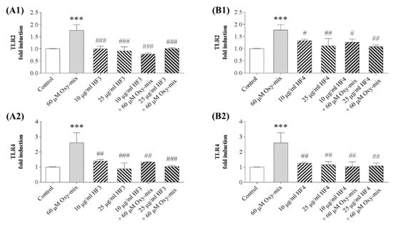 Differentiated CaCo-2 cells incubated with 60 µM Oxy-mix, but pre-treated with 10 or 25 µg/mL HF3 (Figure 5A) or HF4 (Figure 5B), showed a significantly decreased expression of both TLR2 (Figure 5A1,B1) and TLR4 (Figure 5A2,B2) compared to the Oxy-mix sample, suggesting their distinct role in also counteracting the effects of oxysterol.