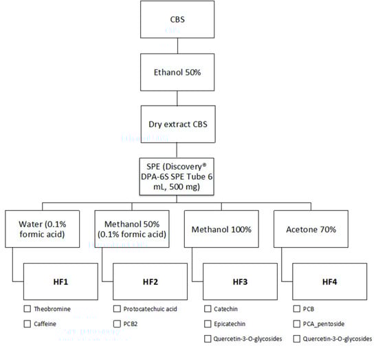 Schematic representation of the extraction and purification procedures to yield the cocoa bean shell (CBS) bioactive compounds. HF1–4: Honduras-Fraction 1–4; PCB: procyanidin B type; PCB2: procyanidin B2; PCA_pentoside: Procyanidin A-type Pentoside.