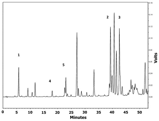 Chromatogram of ethanol extract of propolis used in the study monitored at 290 nm. Peaks are identified as: 1: caffeic acid; 2: chrysin; 3: galangin; 4: quercetin; 5: naringenin.
