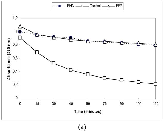 In the BCB assay, the oxidation of linoleic acid produced free radicals due to the removal of the hydrogen atom from diallylic methylene groups of linoleic acid [25]. The highly unsaturated β-carotene then was oxidized by the generated free radical. Degradation of the orange colored chromophore of β-carotene could be monitored spectrophotometrically. However, the presence of antioxidant constituents could prevent the bleaching of β-carotene because of their ability to neutralize the free radical. The reduction of absorbance of β-carotene-linoleic acid emulsion in the presence of the EEP is shown in Figure 3a.