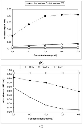 The reducing power of the antioxidant activity measured the color change from yellow to green and blue depending on the EEP reduction power and was an indicator of the antioxidant activity. Figure 3b shows an increase in EEP concentration-dependent reduction ability; the increase was linear (r2 ≥ 0.94), while the absorption at 700 nm for the mixture with ascorbic acid remained fairly constant at higher concentrations (r2 = 0.81), reaching the maximum limit. Slopes of the trend lines (SRP) were calculated (Table 2) for the three lowest concentrations, where r2 > 0.95 for all the samples. The activity of EEP was a bit lower than the activity of ascorbic acid; RSP and EEP versus ascorbic acid was 0.56 ± 0.00 versus 7.53 ± 0.24 (Table 2). The reducing power of the ascorbic acid and the EEP increased with the concentration.