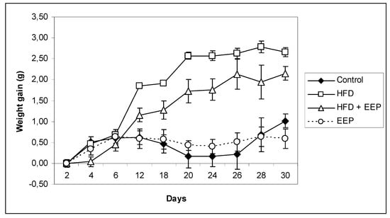 Administration of 50 mg/kg EEP that contained 152.33 ± 2.59 mg/g of total phenols (Figure 1) significantly reduced the weight gain compared to the control group and all other groups (Figure 4). Over the course of the experimental period, none of the experimental animals died, nor did they show abnormal food intake or behavioral changes. Comparison of the weight gain (Figure 4) showed that, until the 10th day, the weight did not differ significantly between the treated groups. At the end of the experimental period on the 30th day of the experiment, mice on a HFD had higher (p ≤ 0.05) weight gain than the control and all other experimental groups (Figure 4). The difference between the control and the HFD receiving groups started to become pronounced and significant from the 20th until the 30th day of the experiment. EEP applied together with the HFD reduced weight gain of the experimental animals (p ≤ 0.05). An important observation from the experimental results is that the weight gain between the control and the HFD + EEP groups became significantly different (p ≤ 0.05) between the 10th and the 20th day of treatment, and this difference contributed to the final difference among those groups and the HFD receiving group at the end of the experiment. The group that received EEP had approximately 33% lower weight gain than all other experimental animals (p ≤ 0.05) (Figure 4).
