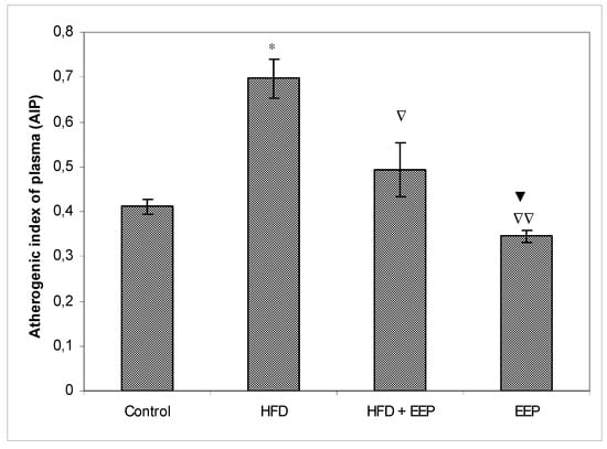 Effect of ethanol extract of propolis on atherogenic index of plasma (AIP). Mice were given HFD, HFD + EEP at a dose 50 mg/kg or EEP (50 mg/kg) once daily for 30 days by a single intragastric application. Atherogenic index of plasma was calculated according to the formula: AIP = Log [TG/HDL-c]. Number of mice per groups: nine. *: Significantly different from the control group (* p ≤ 0.05). ∇ Significantly different from the HFD group (∇ p ≤ 0.05; ∇∇ p ≤ 0.01).▼ Significantly different from the HFD + EEP group (▼ p ≤ 0.05). TG: total triglyceride.