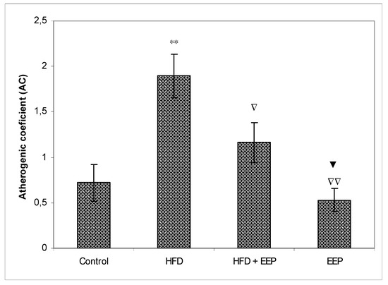 Effect of ethanol extract of propolis on atherogenic coefficient (AC). Mice were given HFD, HFD + EEP at a dose 50 mg/kg or EEP (50 mg/kg) once daily for 30 days by a single intragastric application. Atherogenic coefficient was calculated according to the formula: AC = [TC − HDL-c/HDL-c]. Number of mice per groups: nine. *: Significantly different from the control group (** p ≤ 0.01). ∇ Significantly different from the HFD group (∇ p ≤ 0.05; ∇∇ p ≤ 0.01). ▼ Significantly different from the HFD + EEP group (▼ p ≤ 0.05). TC: total cholesterol.