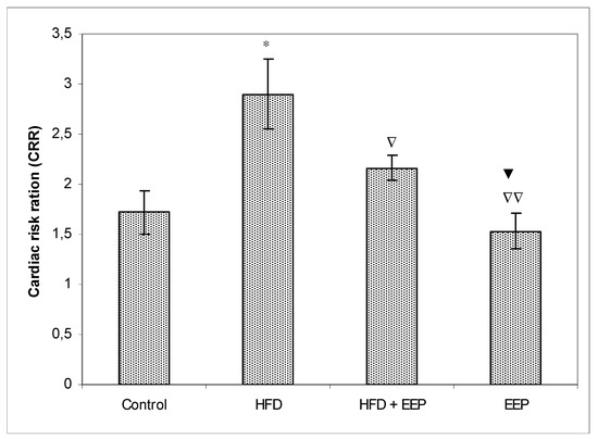 Effect of ethanol extract of propolis on cardiac risk ration (CRR). Mice were given HFD, HFD + EEP at a dose 50 mg/kg or EEP (50 mg/kg) once daily for 30 days by a single intragastric application. Cardiac risk ratio was calculated according to the formula: CRR = [TC/HDL-c]. Number of mice per groups: nine. * Significantly different from the control group (* p ≤ 0.05). ∇ Significantly different from the HFD group (∇ p ≤ 0.05; ∇∇ p ≤ 0.01). ▼ Significantly different from the HFD + EEP group (▼ p ≤ 0.05).
