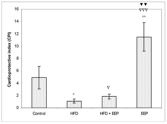 Effect of ethanol extract of propolis on cardioprotective index (CPI). Mice were given HFD, HFD + EEP at a dose 50 mg/kg or EEP (50 mg/kg) once daily for 30 days by a single intragastric application. Cardioprotective index was calculated according to the formula: CPI = [HDL-c/LDL-c]. Number of mice per groups: nine. * Significantly different from the control group (* p ≤ 0.05; ** p ≤ 0.01). ∇ Significantly different from the HFD group (∇ p ≤ 0.05; ∇∇∇ p ≤ 0.001). ▼ Significantly different from the HFD + EEP group (▼▼ p ≤ 0.01).