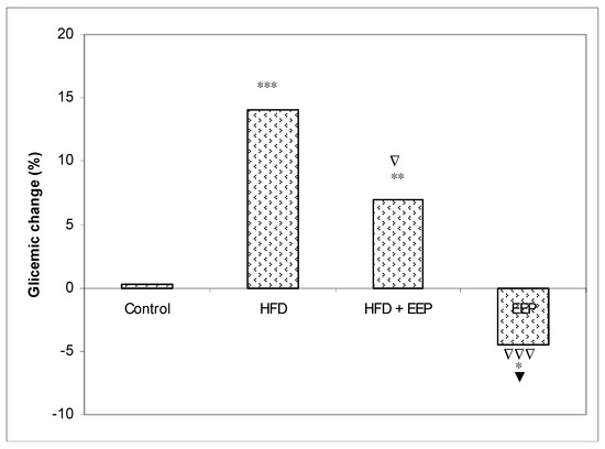 Effect of ethanol extract of propolis on percentage of glycemic change. Mice were given HFD, HFD + EEP at a dose 50 mg/kg or EEP (50 mg/kg) once daily for 30 days by a single intragastric application. The percentage of glycemic changes was calculated according to the formula: Glycemic changes (%) = (Gx − G0) / G0 × 100, where G0 = blood glucose level at 0 day and Gx = blood glucose level at 30 day. Number of mice per groups: nine. * Significantly different from the control group (* p ≤ 0.05; ** p ≤ 0.01; *** p ≤ 0.001). ∇ Significantly different from the HFD group (∇ p ≤ 0.05; ∇∇∇ p ≤ 0.001). ▼ Significantly different from the HFD + EEP group (▼ p ≤ 0.05).