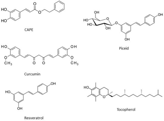 The structure of the flavan-3-ols; catechin, epicatechin, gallocatechin gallate and epigallocatechin gallate. The flavonol kaempferol and flavone luteolin. Caffeic acid phenethyl ester (CAPE), piceid, curcumin, resveratrol and α-tocopherol.