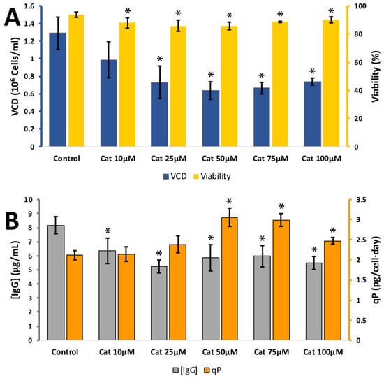 A: Effect of different catechin (Cat) concentrations on viable cell density (VCD) (blue) and viability (yellow) B: effect of different catechin concentrations (10–100 µM) IgG concentration (grey) and relative IgG production (qP) (orange) for CHO cells grown in 24-well plates. Each data point represents the average from a quadruplicate, and the error bars correspond to ±SD. * p-value < 0.05 for the treatment compared to the control.