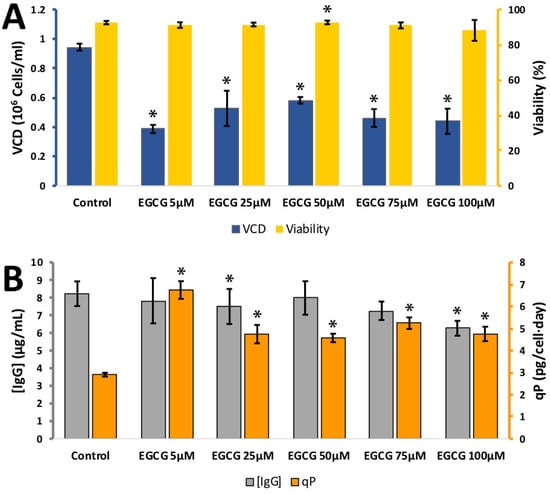 A: Effect of different gallocatechin gallate (GCG) concentrations on viable cell density (VCD) (blue) and viability (yellow). B: effect of different GCG concentrations (10–100 µM) IgG concentration (grey) and relative IgG production (qP) (orange) for CHO cells grown in 24-well plates. Each data point represents the average from a quadruplicate, and the error bars correspond to ±SD. * p-value < 0.05 for the treatment compared to the control.