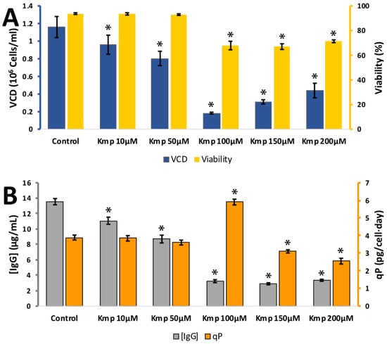 A: Effect of different kaempferol (Kmp) concentrations on viable cell density (VCD) (blue) and viability (yellow) B: effect of different kaempferol concentrations (10–100 µM) IgG concentration (grey) and relative IgG production (qP) (orange) for CHO cells grown in 24-well plates. Each data point represents the average from a quadruplicate, and the error bars correspond to ±SD. * p-value < 0.05 for the treatment compared to the control.