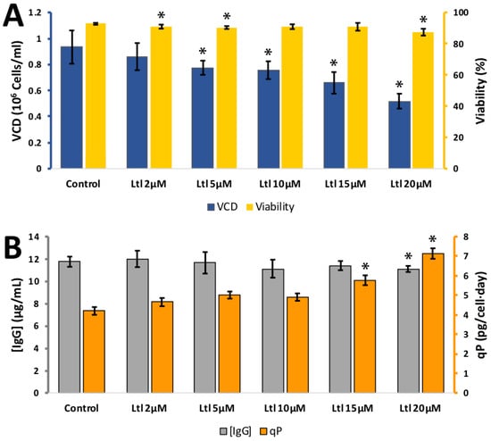 A: Effect of different luteolin (Ltl) concentrations on viable cell density (VCD) (blue) and viability (yellow) B: effect of different luteolin concentrations (10–100 µM) IgG concentration (grey) and relative IgG production (qP) (orange) for CHO cells grown in 24-well plates. Each data point represents the average from a quadruplicate, and the error bars correspond to ±SD. * p-value < 0.05 for the treatment compared to the control.