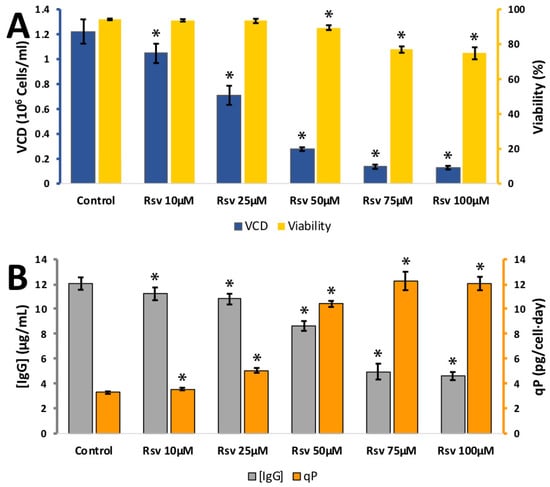 A: Effect of different resveratrol (Rsv) concentrations on viable cell density (VCD) (blue) and viability (yellow) B: effect of different resveratrol concentrations (10-100 µM) IgG concentration (grey) and relative IgG production (qP) (orange) for CHO cells grown in 24-well plates. Each data point represents the average from a quadruplicate, and the error bars correspond to ±SD. * p-value < 0.05 for the treatment compared to the control.