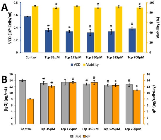 A: Effect of different α-tocopherol (Tcp) concentrations on viable cell density (VCD) (blue) and viability (yellow) B: effect of different α-tocopherol concentrations (10–100 µM) IgG concentration (grey) and relative IgG production (qP) (orange) for CHO cells grown in 24-well plates. Each data point represents the average from a quadruplicate, and the error bars correspond to ±SD. * p-value < 0.05 for the treatment compared to the control.