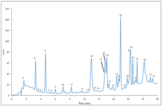A representative high-performance liquid chromatography-diode array detection (HPLC / DAD) (λ = 280 nm) separation of the phenolic compounds present in the Oliva Grossa extra virgin olive oil. For the identification of the peaks and relative compounds, see Table 3.