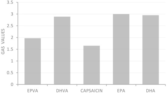 All samples showed moderate ferric reducing power, with FRAP values ranging from 18.2 to 30.0 μM Fe (II)/g. In addition, except for the FRAP test, all samples showed greater activity than the positive controls used as reference compounds in the antioxidant assays. Application of the statistical approach GAS evidenced the following trend: capsaicin > EPVA > DHVA > DHA > EPA (Figure 2).