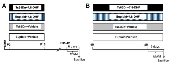 Euploid and Ts65Dn mice were daily subcutaneously injected (at 9–10am) with 7,8-DHF (5.0 mg/kg in vehicle) or vehicle (PBS with 1% DMSO) from P3 to P15. This timing was selected based on a protocol used in a previous study by our group to examine the long-term outcome of other treatments in Ts65Dn pups [12,19,20]. Mice injected with 7,8-DHF will be called “treated mice” (n = 11 treated euploid mice: seven males and four females; n = 9 treated Ts65Dn mice: six males and three females). Mice injected with the vehicle will be called “untreated mice” (n = 11 untreated euploid mice: seven males and four females; n = 10 untreated Ts65Dn mice: six males and four females). Starting from the age of 35–42 days, the behavior of these mice was tested with the Morris Water Maze test (MWM) (Figure 1A).