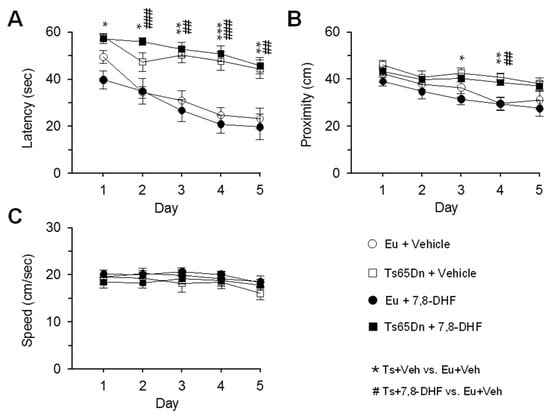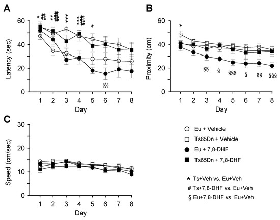 Effect of neonatal treatment with 7,8-DHF on spatial learning in Ts65Dn and euploid mice. Mice were injected with either vehicle or 7,8-DHF in the period P3–P15 and their behavior was tested with the MWM beginning from the age of 35–42 days (untreated euploid mice: n = 11; untreated Ts65Dn mice: n = 10; treated euploid mice: n = 11; treated Ts65Dn mice: n = 9). The data in (A–C) refer to euploid mice that received either vehicle (empty circle) or 7,8-DHF (filled circle) and Ts65Dn mice that received either vehicle (empty square) or 7,8-DHF (filled square). A,B: In the learning phase of the MWM, the latency to reach the platform (A), proximity to the platform zone (B), and swimming speed (C) were evaluated. Values are mean ± standard error (SE). The symbol * indicates a difference between untreated euploid and untreated Ts65Dn mice and the symbol # indicated a difference between untreated euploid mice and treated Ts65Dn. One symbol: p ≤ 0.05; two symbols: p ≤ 0.01; three symbols: p ≤ 0.001 (Fisher LSD test after ANOVA). Abbreviations: 7,8-DHF, 7,8-dihydroxyflavone; cm, centimeters; Eu, euploid; sec, seconds; Ts, Ts65Dn; Veh, vehicle.