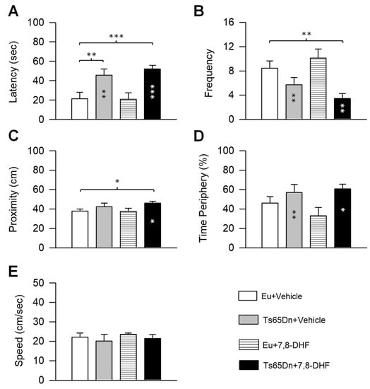 Effect of neonatal treatment with 7,8-DHF on spatial memory in Ts65Dn and euploid mice. Memory was assessed in the probe test as latency to reach the former platform zone (A), frequency of crossings over the former platform quadrant (B), proximity to the former platform zone (C), percentage of time spent at the periphery (D) (same mice as in Figure 2). (E): Swimming speed during the probe test. Values are mean ± SE. * p ≤ 0.05; ** p ≤ 0.01; *** p ≤ 0.001 (Fisher LSD test after ANOVA). Black asterisks in the gray bar indicate a difference between untreated Ts65Dn mice and treated euploid mice; white asterisks in the black bar indicate a difference between treated Ts65Dn mice and treated euploid mice. Abbreviations: 7,8-DHF, 7,8-dihydroxyflavone; cm, centimeters; Eu, euploid; sec, seconds.