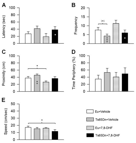 Effect of treatment with 7,8-DHF on spatial memory in adult Ts65Dn and euploid mice. Memory was assessed in the probe test as latency to reach the former platform zone (A), frequency of crossings over the former platform quadrant (B), proximity to the former platform zone (C), percentage of time spent at the periphery (D) (same mice as in Figure 4). E: Swimming speed during the probe test. Values are mean ± SE. (*) p < 0.06; * p ≤ 0.05; ** p ≤ 0.01; *** p ≤ 0.001; (Fisher LSD test after ANOVA). Black asterisks in the gray bar indicate a difference between untreated Ts65Dn mice and treated euploid mice; white asterisks in the black bar indicate a difference between treated Ts65Dn mice and treated euploid mice. Abbreviations: 7,8-DHF, 7,8-dihydroxyflavone; cm, centimeters; Eu, euploid; sec, seconds.
