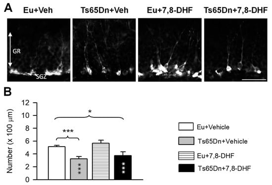 Effect of treatment with 7,8-DHF on the number of new granule neurons in the dentate gyrus. (A): Sections processed for fluorescent immunostaining for DCX from the dentate gyrus of animals of each experimental group. Calibration bar: 50 µm. (B): Number of DCX-positive cells per unit length of the granule cell layer in untreated euploid (n = 6) and Ts65Dn mice (n = 6) and euploid (n = 4) and Ts65Dn (n = 4) mice that received 7,8-DHF. Values are mean ± SE. * p < 0.05; *** p < 0.001 (Fisher LSD test after two-way ANOVA). Asterisks in the gray bar indicate a difference between untreated Ts65Dn mice and treated euploid mice; white asterisks in the black bar indicate a difference between treated euploid and treated Ts65Dn mice. Abbreviations: 7,8-DHF, 7,8-dihydroxyflavone; Eu, euploid; Gr, granule cell layer; SGZ, subgranular zone; Veh, vehicle.