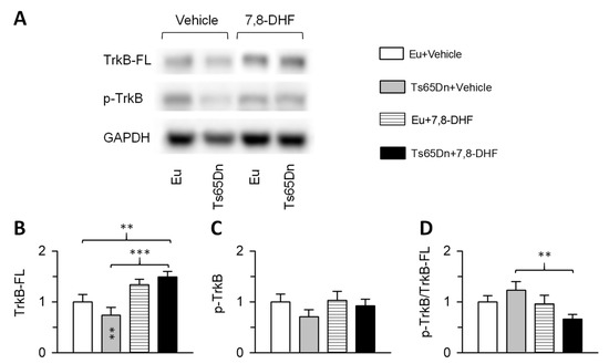 Effects of treatment with 7,8-DHF on the tropomyosin-related kinase receptor B (TrkB) receptor protein levels. (A): representative western blots showing immunoreactivity for the phosphorylated TrkB receptor (p-TrkBTyr816), full length TrkB receptor (TrkB-FL), and housekeeping gene GAPDH. B-D: Levels of TrkB-FL (B), p-TrkBTyr816 (C), and p-TrkBTyr816/TrkB-FL (D) of untreated euploid (n = 8) and Ts65Dn (n = 9) and treated euploid (n = 7) and Ts65Dn (n = 7) mice. Data are expressed as multiple of untreated euploid mice. Values are mean ± SE. ** p < 0.01; *** p < 0.001 (Fisher LSD test after two-way ANOVA). Asterisks in the gray bar indicate a difference between untreated Ts65Dn mice and treated euploid mice Abbreviations: 7,8-DHF, 7,8-dihydroxyflavone; Eu, euploid.