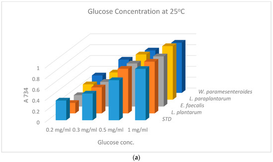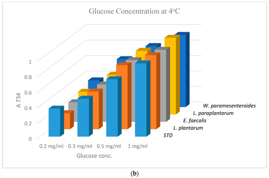 The sugar concentration in grape marmalade was evaluated to 100 mg/g of glucose until the end of preservation. The results of non-inoculated and inoculated grape marmalades are shown in Figure 1, and sugar composition was 0.339 g of glucose at A734 for the freshly prepared samples. Jams and marmalades basically constitute fruit peel, sugar, and water; in addition, the more bitter the peel is, the better the flavor of the marmalade will be. It represents a beneficial origin of dietary fibers, vitamins, and minerals. These nutrients possess healthy benefits in several ways considering when they are incorporated with probiotic bacteria and antioxidants.