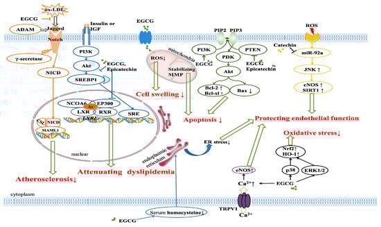 64. Liu, S.M.; Sun, Z.W.; Chu, P.; Li, H.L.; Ahsan, A.; Zhou, Z.R.; Zhang, Z.H.; Sun, B.; Wu, J.J.; Xi, Y.L.; et al. EGCG protects against homocysteine-induced human umbilical vein endothelial cells apoptosis by modulating mitochondrial-dependent apoptotic signaling and PI3K/Akt/eNOS signaling pathways. Apoptosis 2017, 22, 672–680. [Google Scholar] [CrossRef] [PubMed]