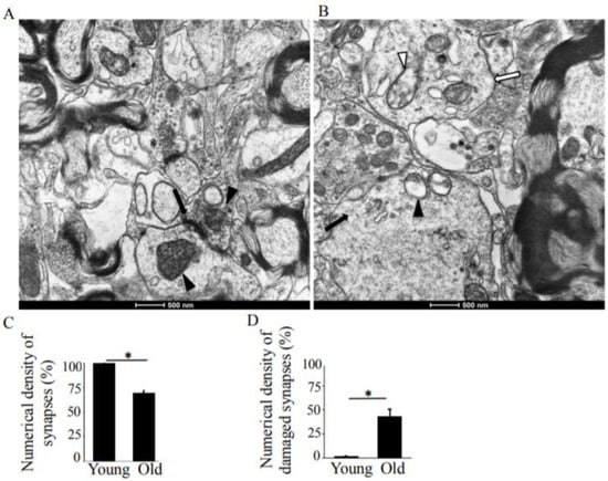 Transmission electron microscopy (TEM) analysis of the hippocampus, CA1 region in young-adult and old rats. (A) A representative TEM image of a young rat CA1 region, demonstrating normal synaptic structure. The pre- and post-synaptic densities are sharply defined and contain electron–dense materials that are uniformly distributed. The arrows show concave curvature of symmetric synapses. The arrowheads point to synaptic mitochondria with normal structure. Magnification ×14,000. (B) TEM image showing degenerative changes in the pre- and post-synaptic compartments. The arrows point to synapses. Magnification ×14,000. (C) Means ± SEM, percent numerical density of synapses in young-adult and old rats. (D) Means ± SEM, percent numerical density of damaged synapses in young-adult and old rats. * indicates significant differences at p < 0.05.