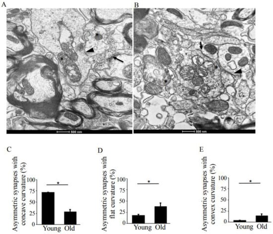 While the total number of asymmetric synapses (Figure 2A,B, arrow) in old rats was comparable to the number in young rats, the number of asymmetric synapses with concave curvature decreased to 1.89 µm2 from 5.6 µm2 (Table 1), a reduction to 28.3% from 72.1% with age (Figure 2C). The number of asymmetric synapses with flat and convex curvatures (Figure 2A,B, arrowheads) increased by 19% and 10%, respectively (Figure 2D,E).