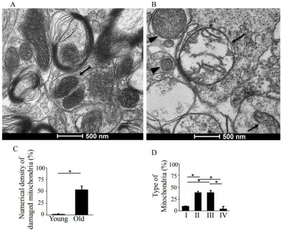 TEM analysis of structural changes in synaptic mitochondria of the hippocampus, CA1 region, in young-adult and old rats. (A) Representative TEM image of young-adult rats, CA1 region, demonstrating normal structure of the synaptic mitochondria (arrow). Magnification ×33,000. (B) TEM image of old rat showing damaged synaptic mitochondria. Arrowhead points to type II mitochondrial damage, while the arrows indicate type III mitochondrial damage. Magnification ×33,000. (C) Means ± SEM, percent numerical density of damaged mitochondria in young-adult and old rats. (D) Means ± SEM, percent type of mitochondria in the synapses of old rats. * indicates significant differences at p < 0.05.
