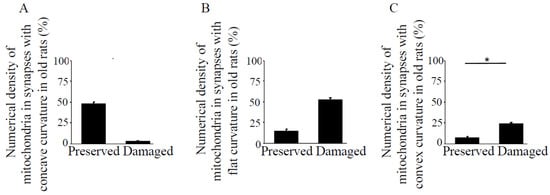 Numerical density of preserved and damaged mitochondria in synapses with different types of curvature in the hippocampus, CA1 region in old rats. Bar graphs represent means ± SEM of percent numerical density of mitochondria in the synapses with (A) concave, (B) flat, and (C) convex curvatures in old rats. * indicates significant differences at p < 0.05.