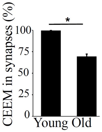 Coefficient of energy efficiency of synaptic mitochondria (CEEM) in the hippocampus, CA1 region, in young-adult and old rats. Means ± SEM, percent CEEM in synapses in young-adult and old rats. * indicates significant differences at p < 0.05.