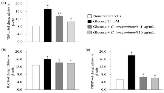 To assess the mRNA expression of pro-inflammatory cytokines (TNF-α and IL-6) and an endoplasmic reticulum (ER) stress marker (CHOP) in hASMCs, we performed qPCR (Figure 1). Our results showed that the mRNA levels of TNF-α and IL-6 increased in 25 mM glucose-treated hASMCs relative to the non-treated cells (Figure 1a,b), but the increased mRNA expression levels of TNF-α and IL-6 was attenuated by treatment with at 1 and 10 μg/mL of the C. turczaninowii extract (Figure 1a,b). The mRNA level of CHOP, an ER stress marker was also increased in 25 mM glucose-treated hASMCs relative to the non-treated cells (Figure 1c); however, the increased CHOP expression was markedly reduced by treatment with 1 and 10 μg/mL of C. turczaninowii extract, and lowered almost to the levels observed in the non-treated cells (Figure 1c). Our results indicate that the mRNA expression of pro-inflammatory cytokines and the ER stress marker, CHOP, may be suppressed by C. turczaninowii extract treatment.