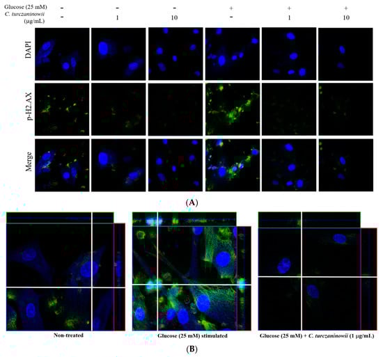 To determine whether high glucose-induced DNA damage in hASMCs is modulated by treatment with the C. turczaninowii extract, we performed immunocytochemistry to measure the expression of p-H2.AX as a marker of activated DNA damage in the cell [28]. Our results revealed that the immunoreactivity of p-H2.AX in hASMCs increased under high glucose conditions, while the increased immunoreactivity of p-H2.AX in 25 mM glucose-treated hASMCs was attenuated by C. turczaninowii extract treatment (Figure 2A,B). Our data shows that the C. turczaninowii extract may inhibit DNA damage in hASMCs under high glucose conditions.
