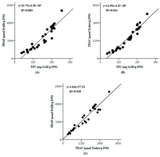 Correlations among FRAP and TPC values (A), TEAC and TPC values (B), FRAP and TEAC values (C). Abbreviations: FRAP, ferric-reducing antioxidant power; TEAC, Trolox equivalent antioxidant capacity; TPC, total phenolic content.