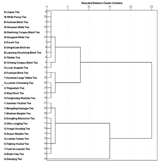 Dendrogram using average linkage (between groups) from systematic cluster analysis for 30 Chinese teas. B, black tea; D, dark tea; G, green tea; O, oolong tea; W, white tea; Y, yellow tea.