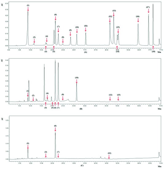 High-performance liquid chromatography (HPLC) Chromatograms under 254 nm of the standard compounds (A); Dianqing Tea (B); Tibetan Tea (C). The numbers in brackets referred to the compounds: gallic acid (1); gallocatechin (2); epigallocatechin (3); catechin (4); chlorogenic acid (5); caffeine (6); epigallocatechin gallate (7); epicatechin (8); gallocatechin gallate (9); epicatechin gallate (10); catechin gallate (11); ellagic acid (12); myricetin (13); quercitrin (14); kaempferol-3-O-glucoside (15); quercetin (16); theaflavine (17); kaempferol (18).