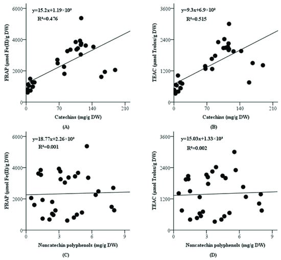 Correlations between FRAP and catechins (A), TEAC and catechins (B), FRAP and noncatechin polyphenols (C) and TEAC and noncatechin polyphenols (D). Abbreviations: FRAP, ferric-reducing antioxidant power; TEAC, Trolox equivalent antioxidant capacity.