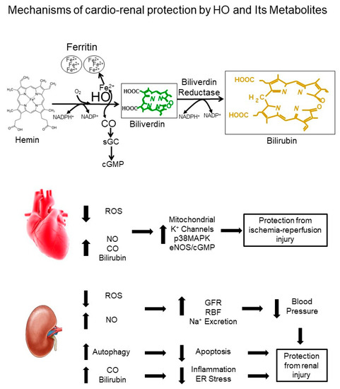 Heme oxygenase (HO) is the rate-limiting enzyme in the breakdown of heme in the body. Two major isoforms of HO exist: heme oxygenase-1 (HO-1) and heme oxygenase-2 (HO-2). Both isoforms of HO are expressed in all tissues of the body. HO-1 is the inducible isoform whose expression is regulated by a wide variety of physiologic and pathophysiologic stimuli [1]. Heme oxygenase-2 is the constitutive isoform of HO found in all tissues and cells of the body [2]. Bilirubin, an endogenous antioxidant derived from HO catabolism of heme is capable of directly scavenging reactive oxygen species (ROS) and inhibiting oxidative stress [3,4,5,6,7]. Carbon monoxide (CO), the other product derived from HO catabolism of heme, is a gaseous transmitter which can affect ion channels, nitric oxide release, as well as mitochondrial proteins [8,9]. An underappreciated aspect of HO breakdown of heme is the release of free iron and its subsequent sequestration by induction of ferritin. Labile iron is toxic due to its ability to release ROS which can then result in cellular damage especially in renal tubule cells [10]. Ferritin is a cytoprotective protein that is also involved in the regulation of myelopoiesis and inflammation [11]. HO-1 induction mediates many beneficial effects in the cardiovascular system and kidney as well as in metabolism [12,13,14]. For this review, we will focus on the role of HO in the cardiovascular system and the potential for targeting this system for the treatment of cardiovascular and end-organ damage.