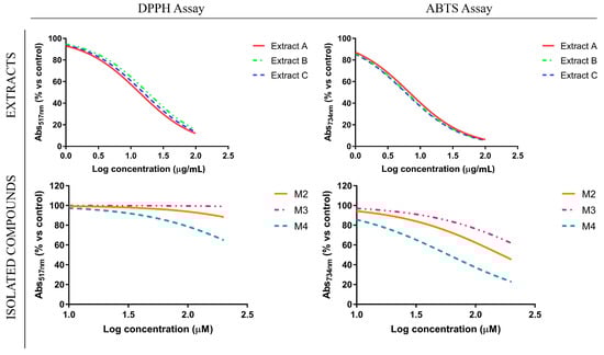 The 2,2′-azino-bis(3-ethylbenzothiazoline-6-sulfonic acid) Diammonium Salt (ABTS) assay was carried out as previously described [27,28]. ABTS radical cation (ABTS• +) was attained by reacting ABTS solution (7 mM) with potassium persulfate solution (2.45 mM) and incubating in the dark for 16 h at room temperature before use. The achieved solution was diluted using ethanol in order to reach an absorbance of 0.70 ± 0.05 (monitored at 734 nm). Different concentrations of extracts or isolated compounds were added to 1 mL of ABTS• + solution and mixtures were incubated under stirring in darkness for 5 min. Absorbance was measured at 734 nm using a UV-Vis spectrophotometer (Ultrospec 2100 Pro, Amersham Biosciences/GE Healthcare).