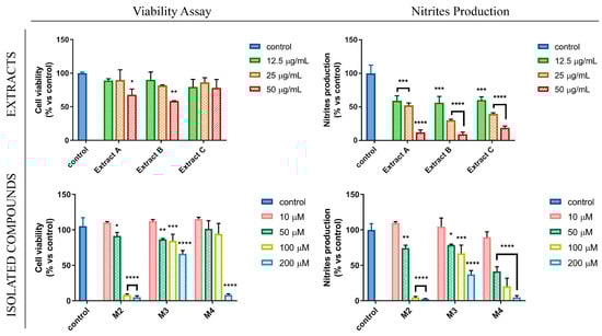 Cell viability was assessed quantifying the mitochondrial-dependent reduction of 3-(4,5-dimethyl-2-thiazolyl)-2,5-diphenyl-2H-tetrazolium bromide (MTT) to formazan by living cells, as previously described [29]. Briefly, RAW 264.7 cells were seeded in 24-well plates at the density of 2 × 105 cells/well, and treated with different concentrations of extracts or isolated compounds for 24 h. At the end of the treatment, MTT solution was added to each well (to a final concentration of 0.5 mg/mL) and plates were incubated at 37 °C for 2 h until the formation of formazan crystals. Then, medium was removed, and the formazan precipitate was solubilized in DMSO. In each well, DMSO-solubilized formazan was quantified by reading the absorbance at 570 nm using a microplate reader (Synergy H1 microplate reader, BioTek).