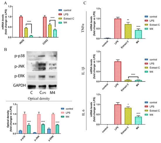 Licoflavanone (M4), as well as the phytocomplex from which it was isolated (extract C), disrupts mitogen-activated protein kinases (MAPK)/NF-kB pathway and modulates pro-inflammatory cytokines in RAW 264.7 cells. (A) Effects of extract C and M4 (both used at their IC50 values) on inducible nitroxide synthase (iNOS) and cyclooxygenase 2 (COX2) mRNA levels. (B) Immunoblotting analysis of phosphorylated MAPKs (p-p38, p-JNK and p-ERK) and relative quantification of expression levels. Glyceraldehyde 3-phosphate dehydrogenase (GAPDH) was used as loading control (C) Effects of treatments on pro-inflammatory cytokines (Tumor Necrosis Factor alpha (TNFα), Interleukin-1 beta (IL 1β) and Interleukin-6 (IL 6)) mRNA levels. Treatment conditions for the different experiments are reported in the Methods (Section 2.11 and Section 2.12). Values represent mean ± S.D. of three independent experiments, each one performed with triplicate samples. * p < 0.05; ** p < 0.01; **** p < 0.001.