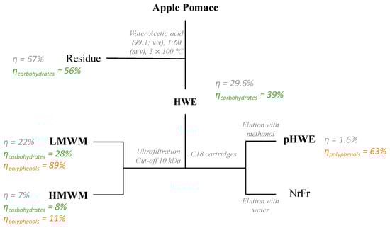 Schematic representation of the fractionation processes adopted in this work and yields of the extracts and polysaccharides in relation to apple pomace and polyphenols present in the hot water extract (dry basis). In bold are highlighted the fractions that were further studied. HWE—hot water extract; LMWM—low molecular weight material; HMWM—high molecular weight material; pHWE—purified hot water extract; NrFr—non-retained fraction.