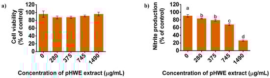 The anti-inflammatory potential of the pHWE was measured by the reduction of nitrite accumulated in the culture medium in comparison with the amount released by untreated LPS-stimulated Raw 264.7 cells. When treated with LPS, NO• released into the culture medium by macrophages increased from the basal value of 0.2 µM to 22 µM. Yet, when pre-incubated with pHWE in all non-cytotoxic concentrations (280, 375, 745, and 1490 μg/mL), the NO• released by macrophages was limited to 26%–84% of the value observed for non-treated cells (Figure 2b) in a concentration-dependent manner.